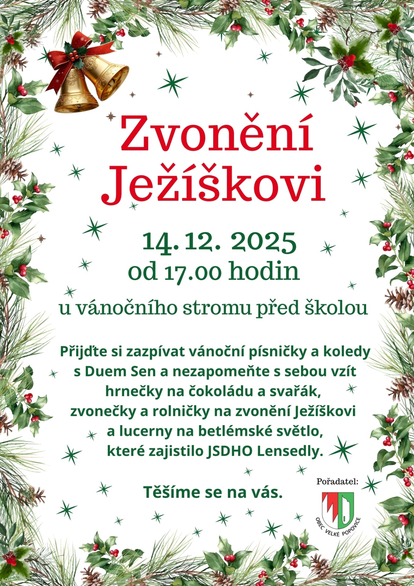 Obec Velké Popovice zve rodiny s dětmi na tradiční adventní akci Zvonění Ježíškovi, která se uskuteční tuto neděli u základní školy Velké Popovice.